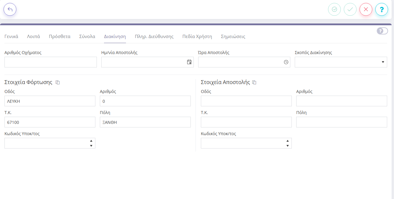 Αφού πραγματοποιηθεί η απαραίτητη παραμετροποίηση, τότε κατά την έκδοση Δελτίου Αποστολής ή κατά την έκδοση όσων παραστατικών συμπεριλαμβάνουν διακίνηση θα εμφανιστεί μια επιπλέον καρτέλα: Το tab Διακίνηση.