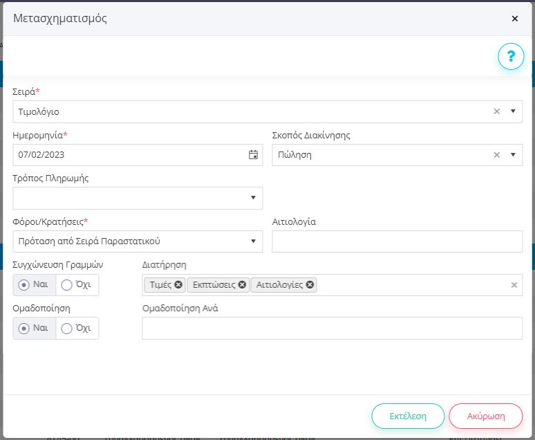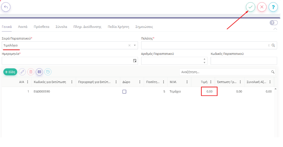 Αφού κάνετε τις επιθυμητές επιλογές, πατάτε στο κουμπί Εκτέλεση για να προχωρήσει η διαδικασία του μετασχηματισμού. Θα σας ανοίξει το παραστατικό με όλα τα είδη που υπήρχαν και στο δελτίο αποστολής. Αν το Δελτίο Αποστολής δεν περιείχε τιμές, μπορείτε στο τιμολόγιο που θα με τροποποίηση να συμπληρώσετε τις τιμές των ειδών και στη συνέχεια να πατήσετε αποθήκευση (πάνω δεξιά)